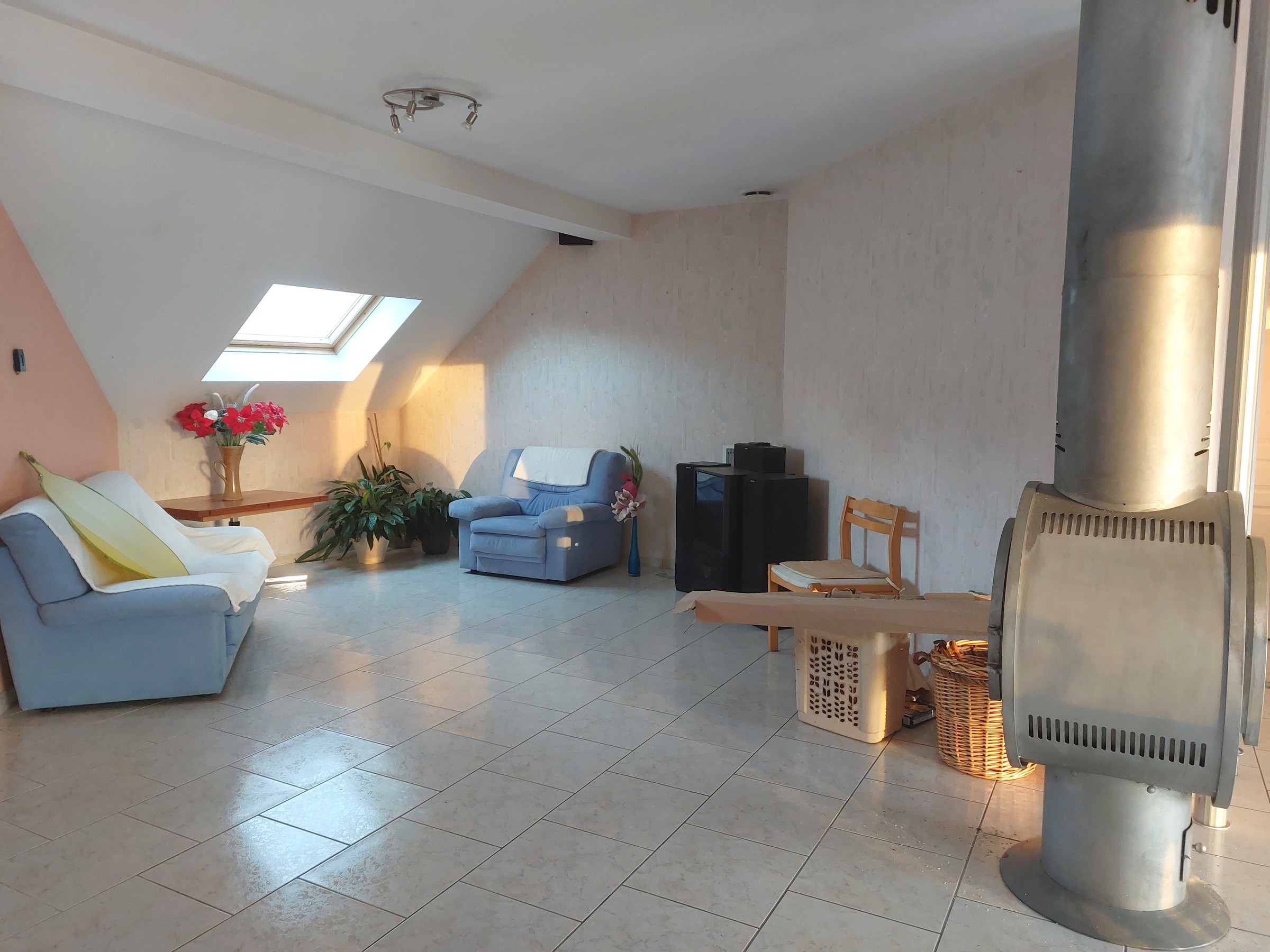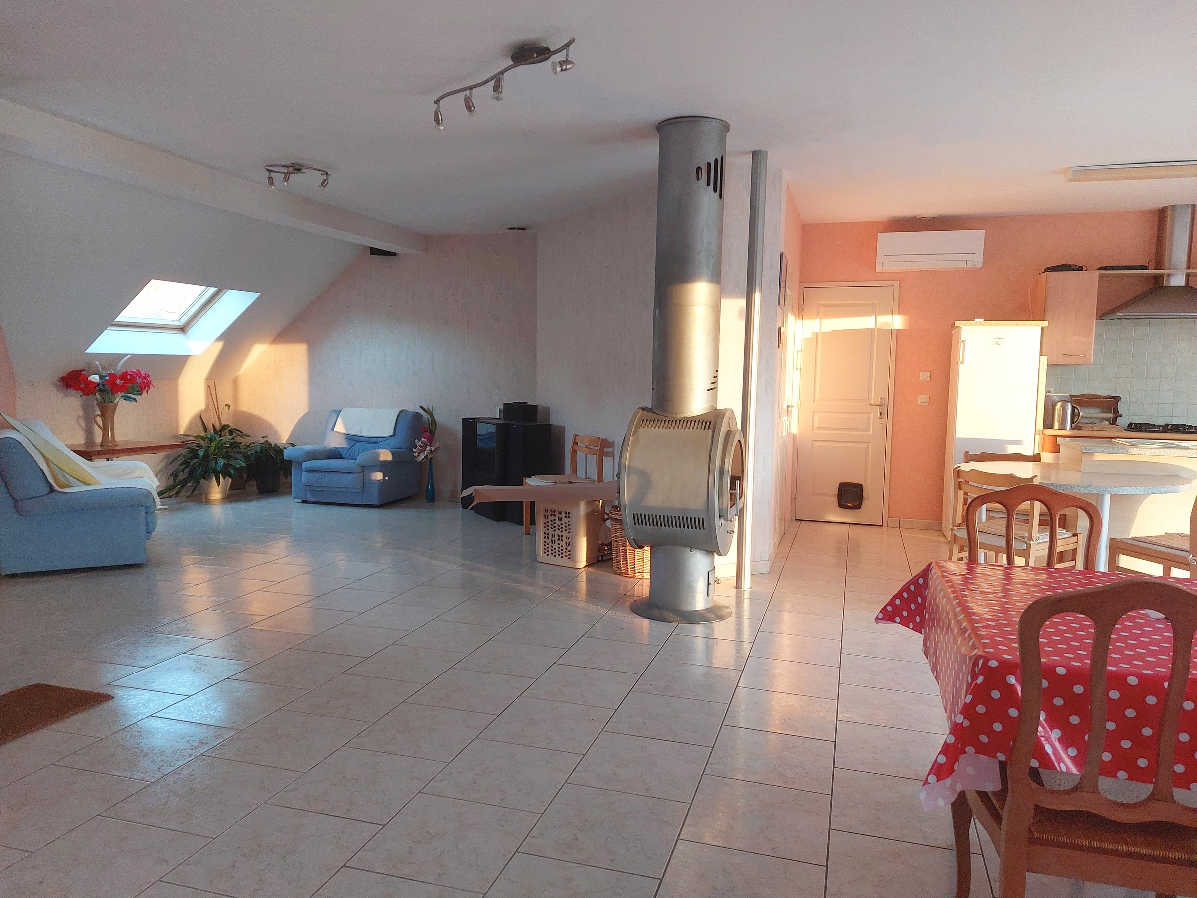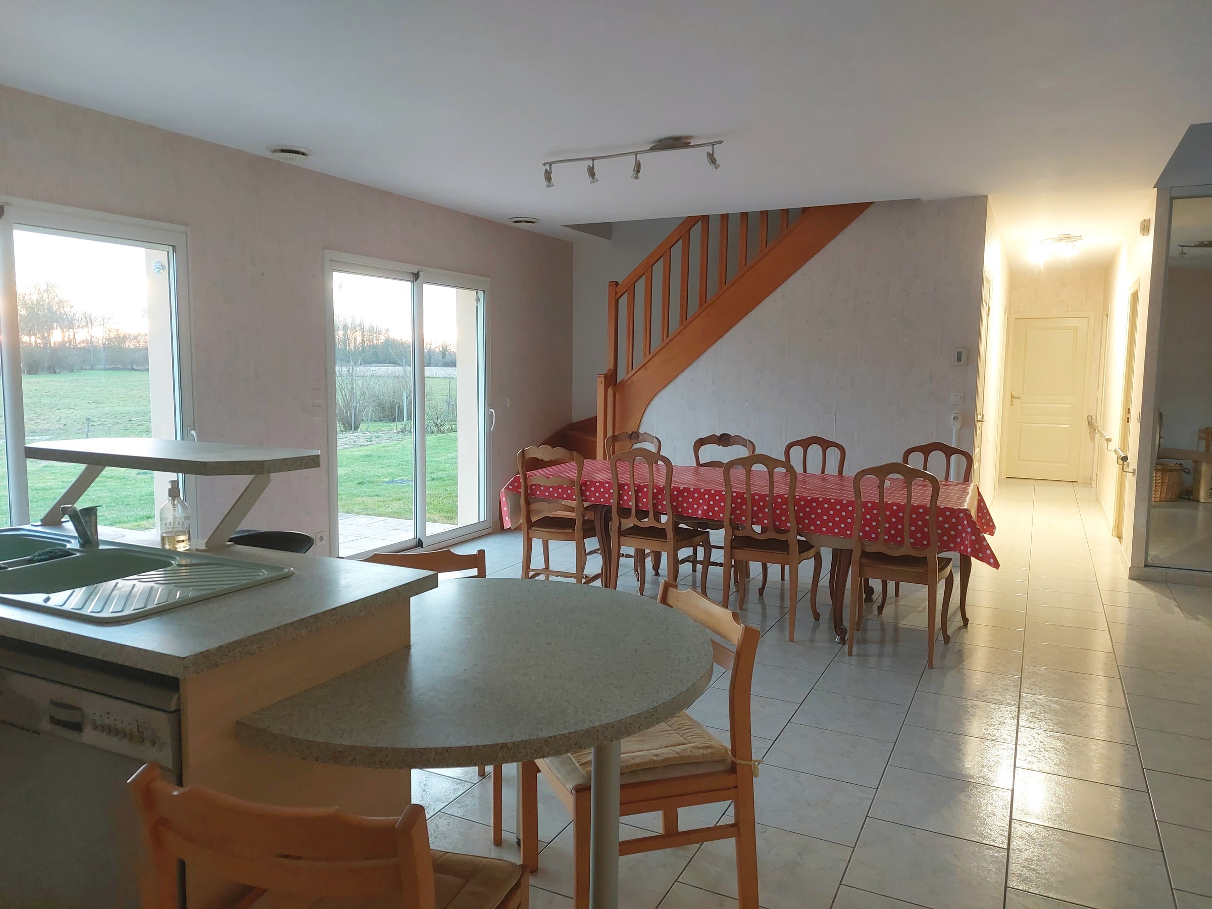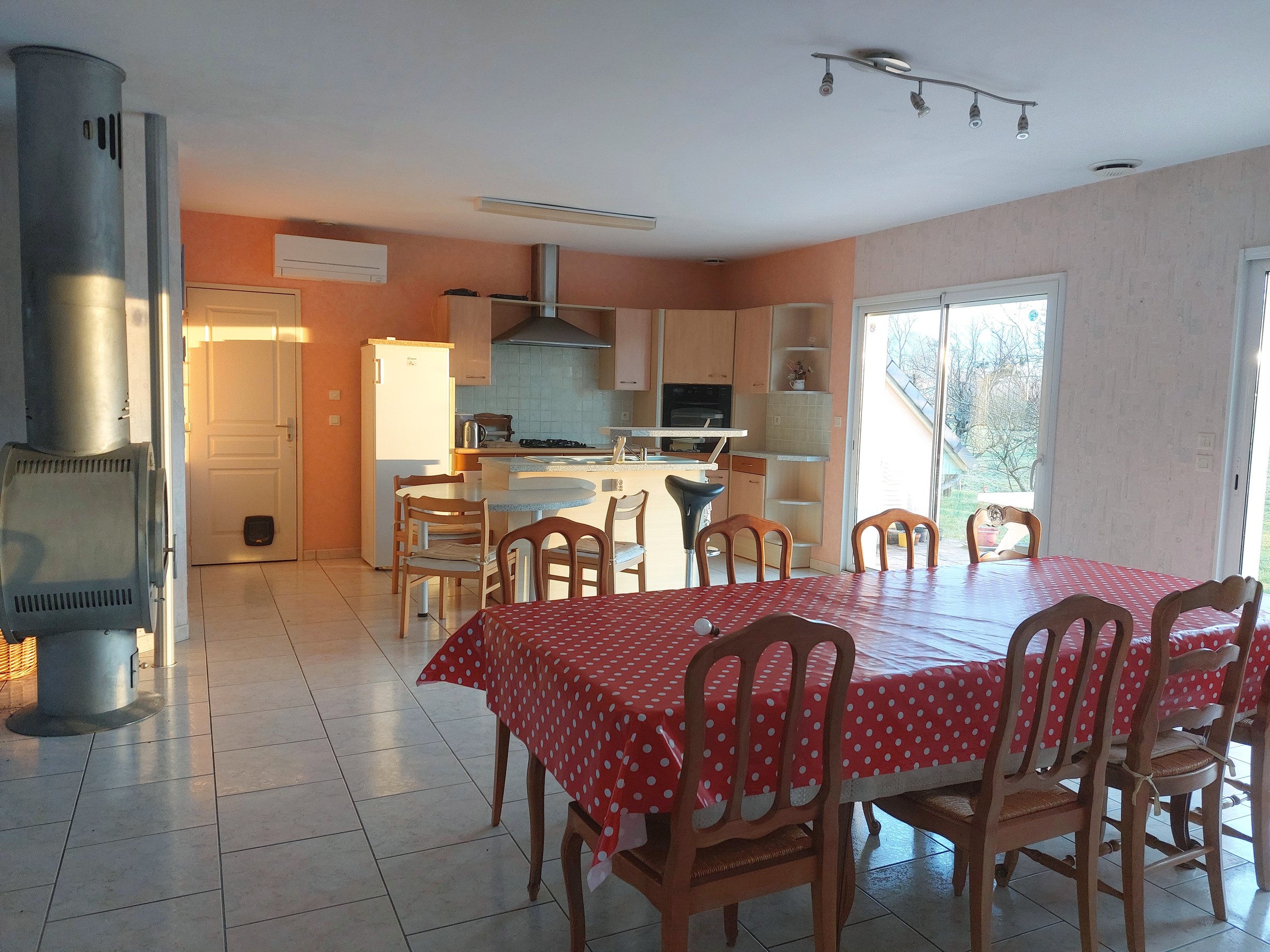 MAISON CONTEMPORAINE implantée dans un cadre champêtre, d’une surface d’environ 170m² habitables, comprenant au rez-de-chaussée: entrée avec grand rangement/penderie , vaste salon avec poêle à bois ouvert sur cuisine aménagée-équipée, arrière cuisine, trois chambres, salle de bains/douche/wc, toilettes indépendants.