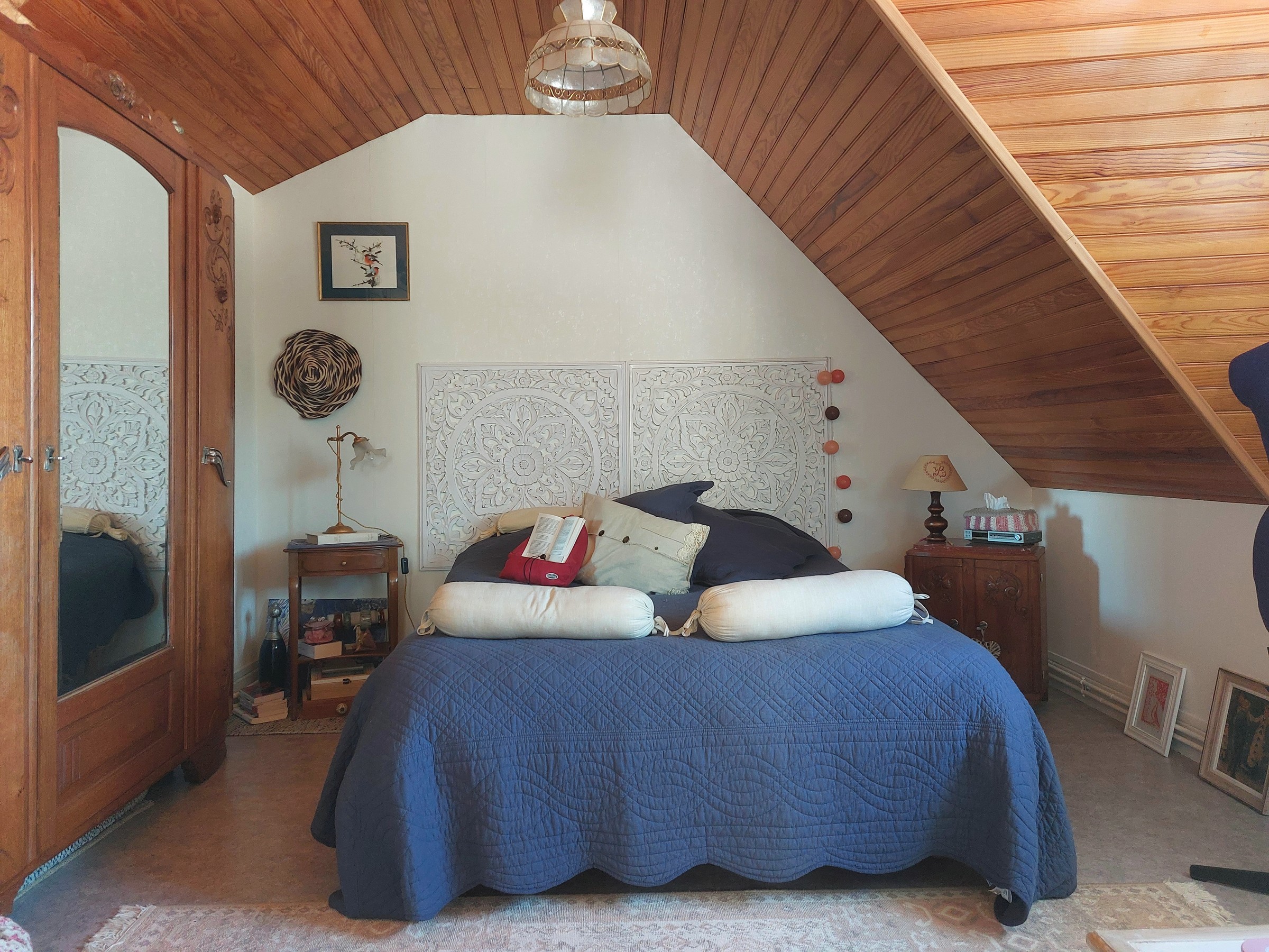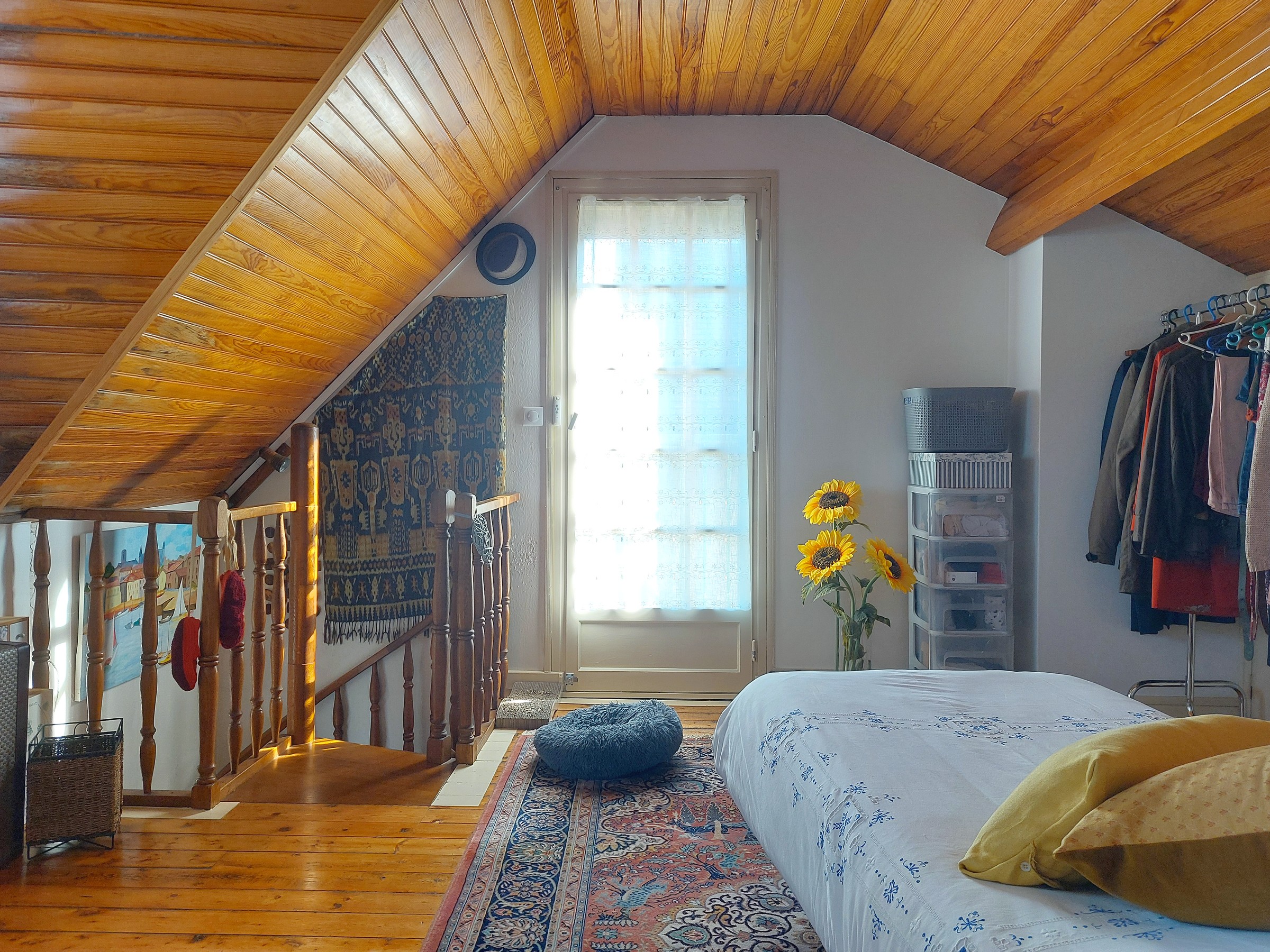 – à l’étage : une pièce palière en parquet et une chambre en parquet avec dressing aménagé dans une sous-pente.